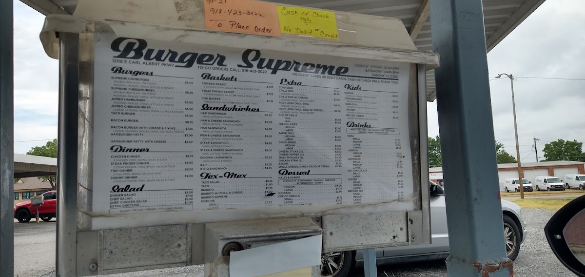 Introducing the menu at Burger Supreme Drive-Inn, located at 1208 E Carl Albert Pkwy, McAlester, OK, showcases a delightful array of burger options and sandwiches that are sure to tantalize your taste buds. Each burger, like the Supreme Hamburger and Bacon Cheeseburger, features hand-formed, fresh patties with all the fixins, ensuring a hearty, flavorful experience that customers rave about.